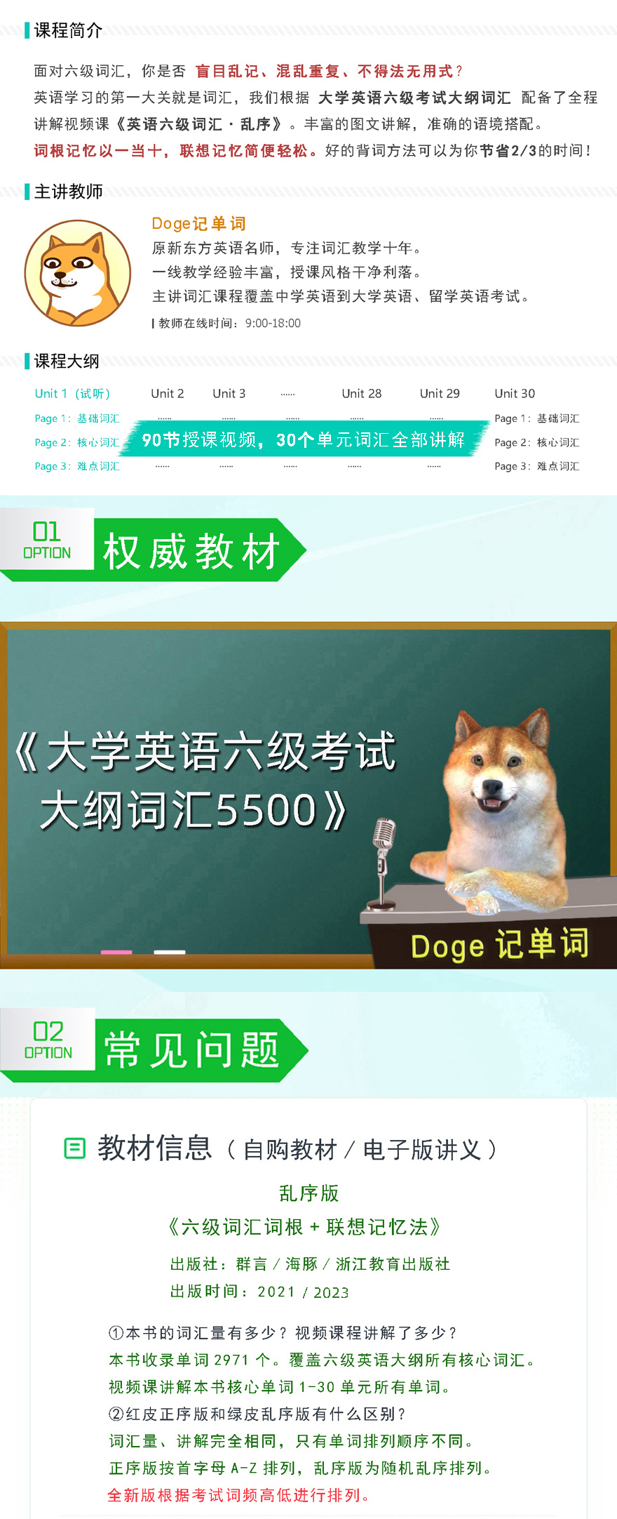 ① 乱序版《六级词汇 词根+联想记忆法》视频课,精讲核心词汇1-30单元,时长56小时。