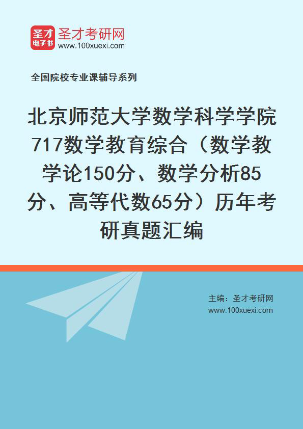 封面 内容简介 目录 第1部分 北京师范大学数学教学论考研真题(共3套) 1989年北京师范大学中学数学教学论述考研真题 1985年北京师范大学中学数学教学论述考研真题 1984年北京师范大学中学数学教学论述考研真题 第2部分 北京师范大学数学教育论述考研真题(共11套) 2002年北京师范大学数学教育论述考研真题 2000年北京师范大学数学教育论述考研真题 1991∼1997年北京师范大学数学教育论述考研真题 1981∼1982年北京师范大学数学教育考研真题 第3部分 北京师范大学数学分析考研真题(共30套) 1978∼2007年北京师范大学数学分析考研真题 第4部分 北京师范大学高等代数考研真题(共24套) 1990∼2007年北京师范大学高等代数考研真题 1981∼1986年北京师范大学高等代数考研真题 说明:近年科目代码和科目名称为717数学教育综合(数学教学论150分、数学分析85分、高等代数65分)。